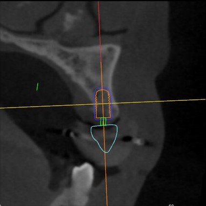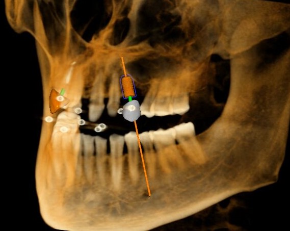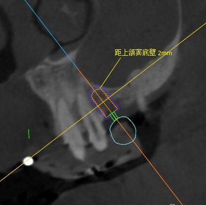 根據(jù)患者CT顯示,使用種植導(dǎo)航軟件設(shè)術(shù)前手術(shù)方案??紤]到患者拒絕手術(shù)摘除上頜竇囊腫等因素,此次手術(shù)選用了Straumann骨水平4.10*8.0mm的植體,植體末端位點設(shè)計距上頜竇底壁2mm處的同時兼顧種植方向和修復(fù)間隙,來達(dá)到理想的效果。